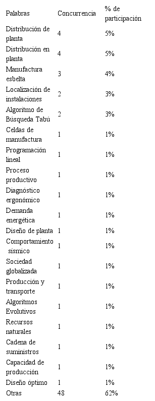 En cuanto a la concurrencia, la palabra clave que más frecuencia tiene para la caracterización del tema de los manuscritos es distribución de planta. Es de acotar que este término fue buscado en Tesauros en español, UNESCO, Buscador del ITESO, y los términos asociados son planeación de las máquinas y planeación de la industria.