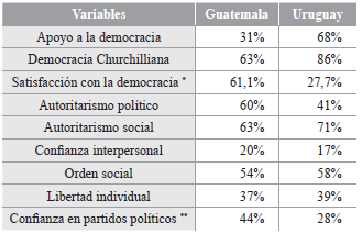Por último, aun cuando se observan similitudes en variables como el autoritarismo social, la confianza interpersonal y la importancia que se le da al orden social vs. las libertades individuales, la cultura política uruguaya mantiene claros atributos democráticos que no se observan para el caso de Guatemala.