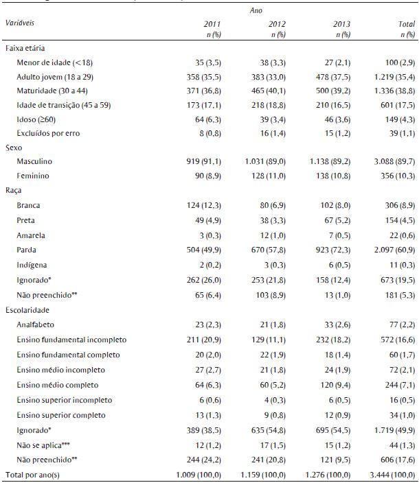 A Tabela 1 apresenta as características sociodemográficas dos trabalhadores acidentados gravemente no período de 2011 a 2013. Houve um total de 3.444 registros de acidentes de trabalho graves no Sinan, em Pernambuco, no período estudado, sendo 29,3% em 2011; 33,7% em 2012 e 37,0% em 2013. Para todos os anos estudados, a maioria dos trabalhadores acidentados encontrava-se na faixa etária de 30 a 44 anos, seguida pelos adultos jovens (18 a 29 anos). Em 1,13% dos casos notificados, a data de nascimento foi preenchida igual à data de notificação, o que evidencia falha no registro da informação. Esses casos foram excluídos do estudo para a análise da faixa etária, mas considerados na análise das outras variáveis. Em relação ao sexo, os homens representaram 89,7% dos trabalhadores que sofreram acidentes de trabalho graves. A maioria dos registros deu-se na raça parda nos anos analisados, mas houve elevado preenchimento do campo "ignorado", que representou 19,5% do total de notificações no período estudado, chegando a atingir 26% em 2011. Quanto à escolaridade, observou-se predominância do ensino fundamental incompleto. Para essa variável foi observada a incompletude do preenchimento em mais de 60% dos casos.