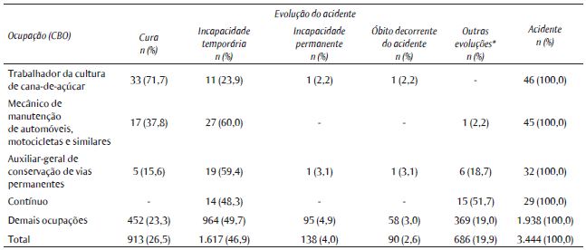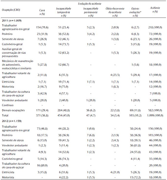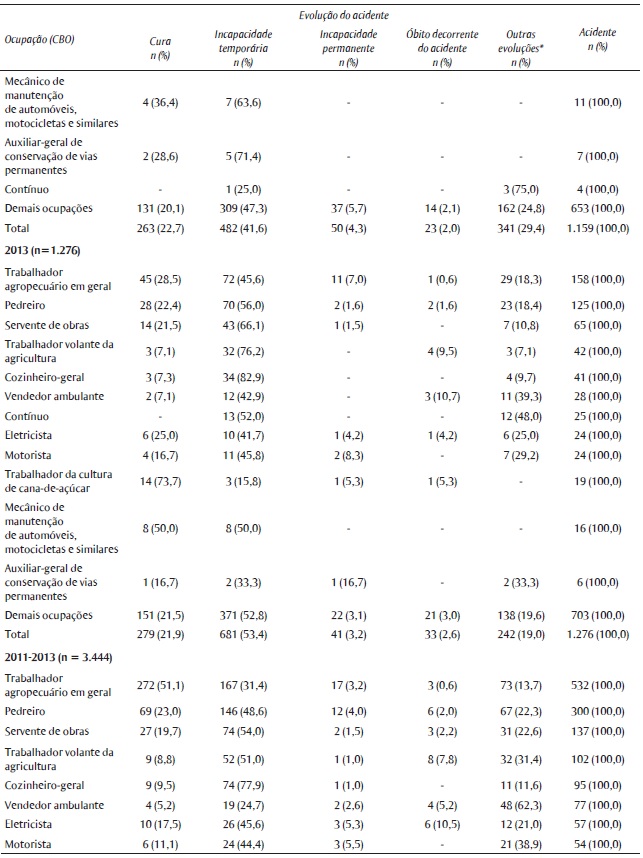 A Tabela 2 apresenta as principais ocupações em que houve registro de acidentes de trabalho graves no período estudado, de acordo com a evolução do caso. Observou-se uma predominância dos trabalhadores da agricultura e da construção civil em todos os três anos analisados. Ao considerar o somatório desses anos, a ocupação em que houve maior número de notificações foi a de trabalhador agropecuário (15,4%), seguida por pedreiro (8,7%) e servente de obras (4,0%). Considerando o total de casos de acidentes graves registrados no período estudado, a maioria evoluiu para incapacidade temporária (46,9%) ou cura (26,5%). Os óbitos corresponderam a 2,6% do total de casos, com importante participação dos trabalhadores volantes da agricultura (8,9% dos óbitos).