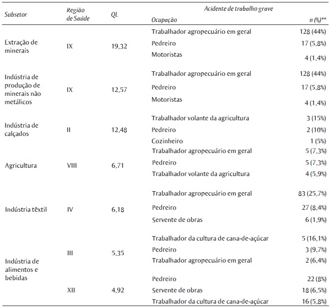 A análise da distribuição geográfica das atividades econômicas mostrou que os setores produtivos não se distribuem homogeneamente em Pernambuco. Como pode ser observado na Tabela 3, há grande concentração regional (QL≥4) para os subsetores de extração mineral, de produção de mineral não metálico, de indústria de calçados, de agricultura, de indústria têxtil e de indústria de alimentos e bebidas. A Tabela 3 também apresenta as Regiões de Saúde onde esses setores produtivos estão inseridos e as três ocupações que mais sofreram acidentes nessas regiões. A concentração produtiva para os demais setores encontrou-se abaixo do ponto de corte adotado por este estudo (QL<4), ao considerar a distribuição por Regiões de Saúde.
