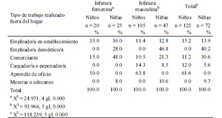 La relación entre la jefatura femenina de hogar y el trabajo infantil fuera del hogar es evidente en el caso de las niñas y en las colonias con mayor desventaja socioeconómica. La prevalencia de trabajo infantil de los varones fue mayor en los hogares con jefatura masculina y, en la mayoría de los casos, correspondió a trabajo de aprendizaje de oficios; sin embargo, ellos también enfrentan, independientemente del horario de regreso a la casa, o del lugar donde trabajan, una mayor frecuencia de asaltos y golpes. No hubo reportes de abuso sexual. Los hogares con jefe varón, envían a sus hijas a trabajar en hogares como empleadas domésticas, lo que significaría un supuesto menor riesgo de abuso. Sin embargo, el trabajo doméstico es uno de los sectores menos regulados del mundo laboral los niños y las niñas que trabajan en hogares particulares son prácticamente invisibles y su magnitud es sumamente difícil de cuantificar. En el trabajo doméstico infantil en hogares diferentes al propio, es importante saber con quiénes trabajarán, ya que, dependiendo de la edad y del sexo, se puede privilegiar el establecimiento de relaciones laborales con personas conocidas, como algún familiar, amigos/as o vecinos y conocidos. En los casos en los que la niña o niño trabaje junto a algún miembro de la familia existe la visión de que estos menores estarán bien protegidos, ya que sus padres y familiares evitarán su exposición a riesgos o peligros, o a tareas pesadas, prolongadas, intensas, o nocivas. Sin embargo, estas niñas y niñas, también son vulnerables a la violencia, la explotación, el maltrato y al abuso y explotación sexual. En esta desprotección de derechos, se confirma la mayor vulnerabilidad de las niñas, respecto a los niños.