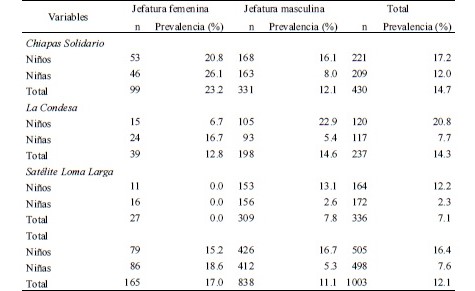 La relación entre la jefatura femenina de hogar y la marginalidad de las colonias que se encuentran en condición de pobreza, y que esta a su vez se relaciona con una mayor probabilidad de trabajo infantil, se aprecia al contrastar las tres colonias en estudio. La más marginada (Chiapas Solidario) registró la prevalencia más elevada de trabajo infantil (14.7 por ciento); la menos marginada, la más baja prevalencia (7.7 por ciento).