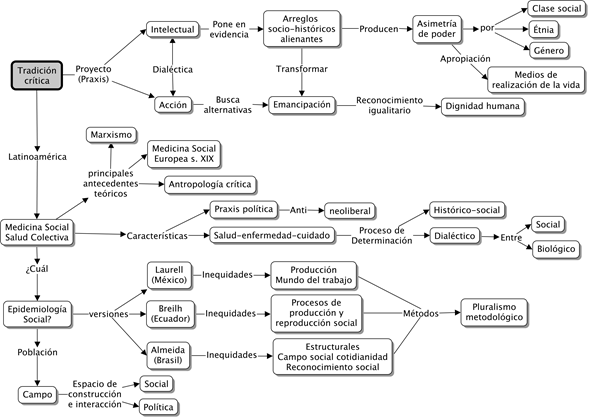En Latinoamérica surge en la década de los 70 el movimiento de la Medicina Social Latinoamericana y la Salud Colectiva, a partir de una tradición crítica de la sociedad para comprender y transformar los fenómenos relacionados con el proceso salud - enfermedad - cuidado en nuestro subcontinente 44) (45) (46) (47. Aunque surge del pensamiento crítico, no es un movimiento homogéneo pues se alimenta intelectualmente del materialismo histórico, de las teorías del conflicto en las ciencias sociales, de la antropología crítica y de corrientes neo-marxistas 48. Sin embargo, las distintas versiones tienen en común una postura explícitamente contra-hegemónica al modelo civilizatorio actual basado en una sociedad de mercado, un vínculo entre la generación de conocimiento y la praxis política, un esfuerzo por comprender la realidad de los fenómenos de la salud, la enfermedad y el cuidado como un todo que reconoce una relación dialéctica entre lo biológico y lo social como procesos dinámicos e históricos 38) (49) (50.