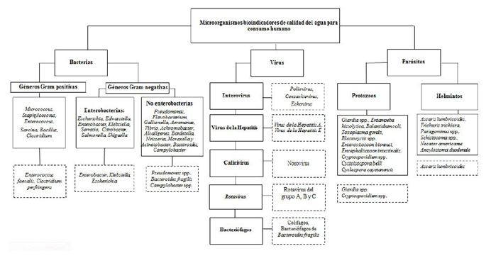 Con base en los criterios mencionados los indicadores microbiológicos de contaminación del agua generalmente han sido bacterias de la flora saprófita intestinal, entre las que se encuentran Bacteroides fragilis, bacterias mesófilas, coliformes totales, y fecales [termotolerantes], Escherichia coli y estreptococos fecales. Algunas de estas, de origen animal [generalmente de explotaciones pecuarias], representan un alto potencial zoonótico, siendo abundantes estreptococos fecales y parásitos como Giardia intestinalis y Cryptosporidium spp., que tienen una mayor resistencia a los procesos de tratamiento y desinfección del agua para consumo humano 8.