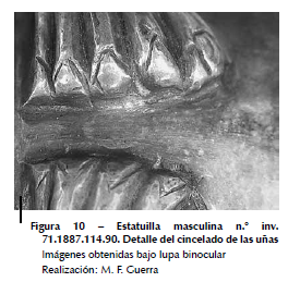 Las soldaduras que se ven en la unión de las piernas y los pies son gruesas. El análisis se ha realizado por FRX y los resultados indican una aleación típicamente moderna con altos porcentajes de estaño y plomo como lo muestra el cuadro 3 (en las soldaduras más finas se trata solamente de una estimación de la composición13).