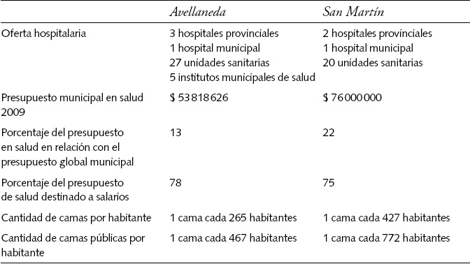 La oferta hospitalaria pública en Avellaneda está constituida por tres hospitales provinciales y uno municipal. El municipio también dispone de 27 unidades sanitarias o centros de salud, además de cinco institutos municipales de salud (véase Cuadro 1). El presupuesto en salud de 2009 ascendió a 53 818 626 pesos, lo que representaba 13 por ciento del presupuesto total del municipio.