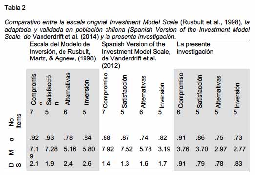 Posteriormente, (Vanderdrift et al., 2014) validaron la Escala del Modelo de Inversión en población hispana en Chile (Spanish Version of the Investment Model Scale), misma que ha generado información valiosa respecto a estudios que predicen la disolución-mantenimiento de los vínculos de pareja (Le et al., 2010), así como la persistencia asociada a comportamientos de sacrificio, interdependencia cognoscitiva y confianza (Wieselquist, Rusbult, Foster, & Agnew, 1999).