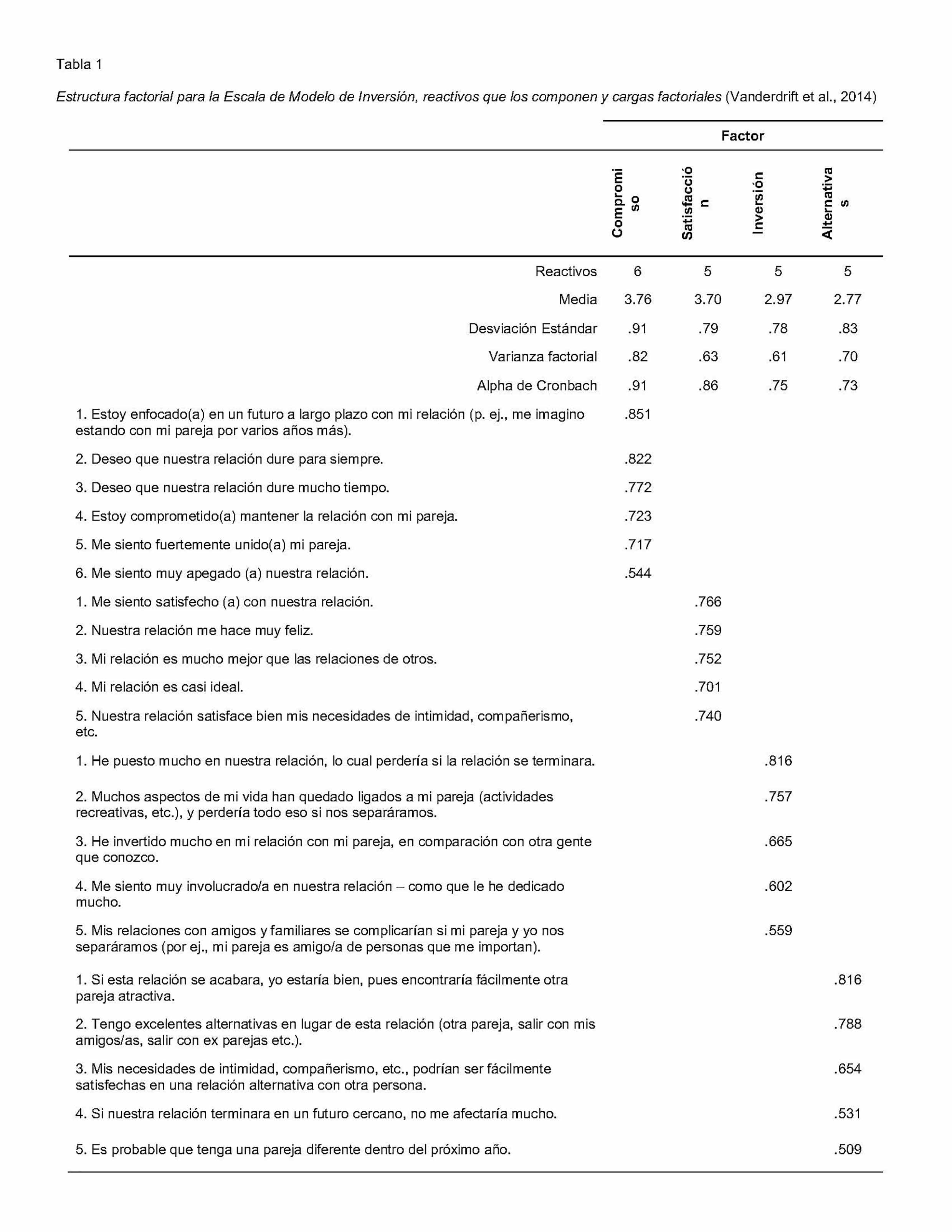 Escala del Modelo de Inversión, traducida y adaptada de la versión del idioma español validada en Chile por (Vanderdrift et al., 2014) que consta de 22 reactivos tipo Likert con 9 opciones de respuesta que indican grados de acuerdo con cada afirmación. Por medio de un análisis factorial exploratorio con rotación Promax que explicó el 62.79% de varianza, se obtuvieron cuatro factores con valor propio mayor a uno: 1) Satisfacción: mide beneficios y satisfacción de necesidades afectivas (α=.87), consta de 5 reactivos como, por ejemplo, “Me siento satisfecho/a con nuestra relación”; 2) Alternativas: mide el grado de deseabilidad percibida en la mejor opción disponible a la relación (α=.82), consta de 5 reactivos como: “Hay otras personas que me atraen mucho con las que puede que me involucre como pareja”; 3) Inversiones: mide la magnitud e importancia de los recursos asociados a la relación actual (α=.74), consta de 5 reactivos como, por ejemplo, “Muchos aspectos de mi vida han quedado ligados a mi pareja (actividades recreativas, etcétera.), y perdería todo eso si nos separamos”; y 4) Compromiso: mide la intención de persistir en la relación actual (α=.88), consta de 7 reactivos tales como “Deseo que nuestra relación dure para siempre”. Dado que en la presente investigación se retomó la versión chilena, fue necesario el realizar algunas adaptaciones léxicas con el objetivo de emplear la variante del español mexicano como, por ejemplo, decía “He puesto mucho en nuestra relación, lo cual perdería si la relación se terminara” y se modificó: “He invertido mucho en mi relación con mi pareja, en comparación con otra gente que conozco”. Cabe mencionar que la presente versión incluía únicamente cinco niveles de respuesta en la Escala Likert.