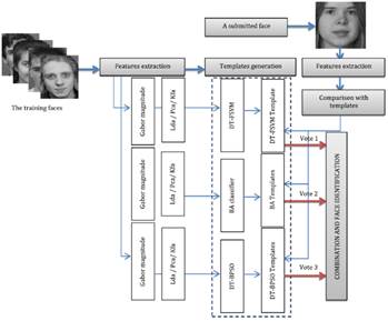 Por otra parte los autores Salima Nebti y Abdallah Boukerram (Nebti & Boukerram 2017) dicen que los sistemas de seguridad para el control de acceso son vulnerables y poco seguros, por eso se ha venido trabajando con biometría intentando mejorarlos, por este motivo proponen dos modelos diferentes de reconocimiento facial, uno basado en un enjambre de abejas y el otro un enjambre de partículas basado en un árbol de decisión, el valor de acierto en la clasificación para los dos se compara con un sistema de clasificación difuso (FSVM). El algoritmo utilizado se basa en tres partes, la detección del rostro, la extracción de características y el módulo de clasificación, la estructura del algoritmo se puede observar en la figura 10.