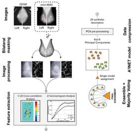 Entre los trabajos realizados se encuentra el de Magna, Casti, Jayaraman, Salmeri, Mencattini, Martinelli y Natale (Magna et al. 2016) que busca utilizando un modelo del sistema inmunológico artificial encontrar asimetrías en mamografías para poder detectar cáncer de seno, para lo cual entrenan el modelo con una base de datos patrón. Para el desarrollo del trabajo se usan alrededor de 200 muestras. Las cuales se procesan y segmentan para extraer 24 características, con los patrones previamente entrenados se clasifican los resultados en clases predefinidas. En la figura 11 se puede ver la estructura propuesta.