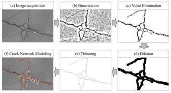 En otro caso, Hyun Yoo y Young Kim (Yoo & Kim 2016) presentan un algoritmo para el procesamiento digital de una imagen de una vía utilizando redes neuronales con el fin de segmentar la grietas adecuadamente quitando fisuras falsas provenientes de rayones en el suelo o elementos externos producto del tránsito normal. En la figura 13 se puede ver el procesamiento digital que se realiza a la imagen, después de la adquisición se hace la binarización para después aplicarle un filtrado de ruido, seguido de operaciones morfológicas para tener una mejor definición. A la red neuronal ingresan las características propias de los pixeles negros de la imagen procesada como el área, distribución, intensidad, espesor de los vecindarios, entre otras. A la salida se obtendrá la segmentación de la grieta sin las fisuras falsas.