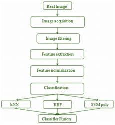 En los últimos años el procesamiento digital de imágenes utilizando lógica difusa se ha incrementado, a continuación se muestran algunas aplicaciones como la realizada por Amir Mollajan, Javad Ghiasi y Hossein Memarian (Mollajan et al. 2016) en donde el objetivo es desarrollar un algoritmo para la identificación de 5 tipos de poros diferentes en rocas carbonatadas. El algoritmo se desarrolla en 5 etapas como se observa en la figura 1, las cuales son la filtración y segmentación, para separar por colores los poros que se encuentren; la extracción de características en donde aplicando máscaras se obtienen patrones característicos para su posterior clasificación; las últimas etapas consisten en aplicar 3 diferentes procesos para clasificar la muestra.