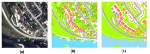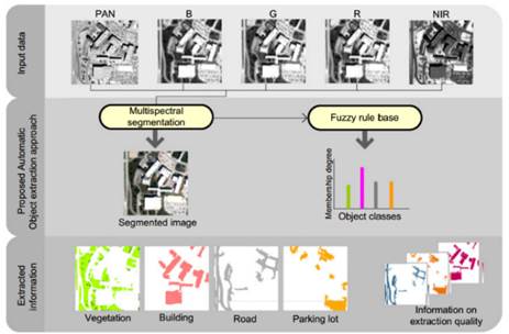 Otra aplicación es la desarrollada por Imane Sebari y Dong-Chen (Sebari & He 2013) quienes implementaron un conjunto difuso multisalida el cual extrae elementos urbanos como vegetación, edificios, calles y parqueaderos al aire libre de imágenes del satélite VHSR. El algoritmo de segmentación utilizado fue el propuesto por Sebari y He(Sebari & He 2009) donde la única entrada es la imagen; los autores realizan esto utilizando los métodos de crecimiento por regiones y la segmentación por umbral. El conjunto difuso adquiere los datos de las segmentaciones y dependiendo de su valor se asigna a cada parte un atributo especial para poder situarlo en alguna categoría, en la figura 2 los autores muestran el proceso completo de extracción de objetos.