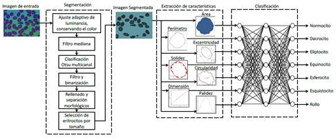 Uno de los campos en el que más se utiliza este tipo de redes es medicina, los autores Marcela Mejía y Marco Alzate en (Mejía & Alzate 2015) desarrollan una herramienta de apoyo diagnóstico para el examen de frotis de sangre periférica, en la cual con ayuda de una red neuronal buscan la clasificación de siete anormalidades en eritrocitos. La metodología consta de dos partes, un proceso de segmentación y uno de extracción; se usaron 23 imágenes, en las cuales fueron clasificados 265 eritrocitos de forma aislada por expertos. En la figura 4 se muestra la metodología de trabajo.