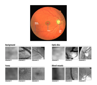 Por otra parte J .Tan, R. Acharya, S. Bhandary y K. Chua en (Tan et al. 2017) presentan un algoritmo de segmentación de imágenes oculares en donde se buscan identificar los vasos vasculares, la fóvea, el disco óptico y el fondo del ojo utilizando una red neuronal convolucional. En la figura 8 se observan las regiones de interés que se desean detectar; la red neuronal consta de 3 canales, esto se realiza para disminuir el costo computacional del programa usando imágenes más pequeñas pero brindándole más información a la red al tener una entrada múltiple. Para el entrenamiento se utiliza el algoritmo de back-propagation.