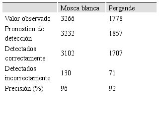 Los resultados que se observan en la tabla 3 muestran una precisión del 96% en la detección de moscas blancas y del 92% para pergande, una aproximación bastante elevada para un trabajo que actualmente realiza una persona y su efectividad depende de su experiencia en el reconocimiento de insectos.