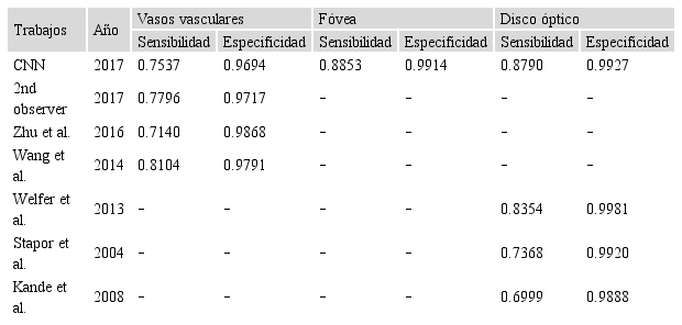 Los resultados en comparación a otros trabajos se muestran en la tabla 4, en donde se manejan 2 indicadores, el primero de sensibilidad que representa el porcentaje de pixeles identificados correctamente de la parte objetivo y la especificidad que es el porcentaje de pixeles que no fueron asignados a un grupo incorrecto.