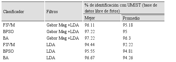 En el enjambre de partículas con base en el árbol de decisión (BPSO) las clases se van ramificando en niveles dependiendo de las características extraídas, de esta forma se llega al final de la rama que cumple en mayor porcentaje con los rasgos. Por otra parte la colonia de abejas (BA) crea un vecindario y las abejas empiezan a moverse buscando la mejor solución al patrón dado, en donde se resuelva un problema de minimización. Los resultados de la comparación con filtros combinados y con el clasificador difuso se muestran en la tabla 5.