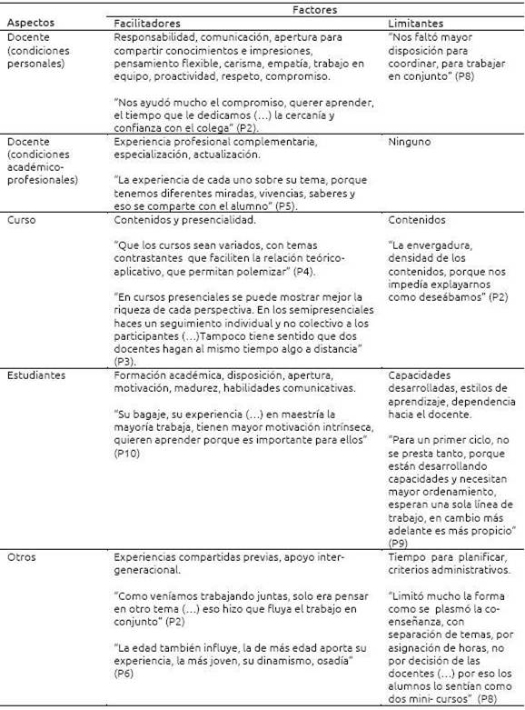 Como factores facilitadores de la co-enseñanza, se identificaron los que refiere la literatura (Cook, 2004; Villa et al., 2008; Velasco et al., 2012; Nierengarten, 2013), prevaleciendo los aspectos personales que Graziano y Navarrete (2012) subdividen en "factores críticos" (responsabilidad, respeto, colaboración y compromiso), y "requerimientos específicos" (empatía, tiempo para coordinar, disponibilidad personal al intercambio y saber trabajar en equipo). Estos últimos fueron también los más citados como factores limitantes.