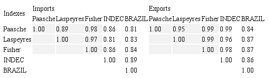 own elaboration based on INDEC and IPEADATA-FUNCEX.To verify the degree of correlation between these indexes, we built correlation coefficients[6] (Gaulier et al., 2008). As can be seen in Table 1, the price indexes of imports and exports are highly correlated, which indicates that no outliers have been left in the sample.