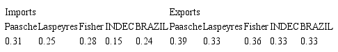 At the general level, the INDEC index of imports has a volatility of 15% (well below the Brazilian one). As can be seen in Table 2, only the Paasche index doubles the variability of the INDEC. Regarding exports, the variability is lower and closer to the official indexes. Both INDEC and Brazil have indexes with the same variability (33%) and our estimated indexes have similar VC to the benchmarks.