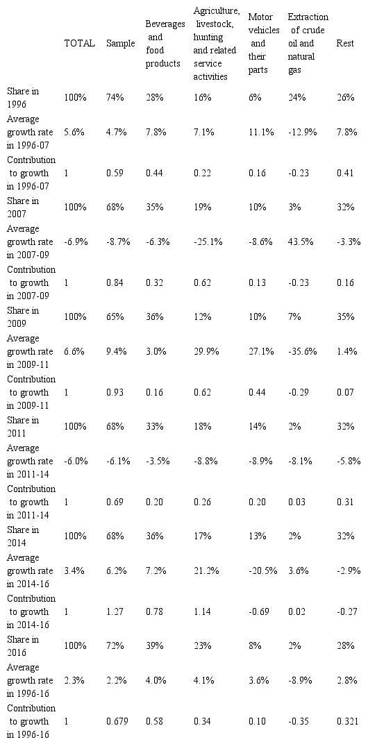 As shown in Table 3, the real exports grew at an annual average rate of 2.3% for the whole period. This is mainly explained by the agricultural products and manufactures based on agricultural resources (such as Food and Beverages), which showed an average annual growth rate of 4% and have a high initial share that increased towards the end of the period. On the other hand, Oil and natural gas extraction activity made an important negative contribution not only because of the average fall of 9% per year, but also because of its high initial share. In short, during the period 1996-2016, the export basket was concentrated in primary products and their manufactures, to the detriment of fuels and energy.