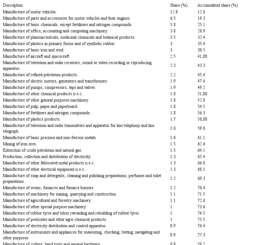 Before the identification of the outliers, we calculate the unit value of each product by means of the ratio between the value and the kilograms. Several criteria were taken into account in the sample selection procedure: 1) the share of the product (8-digit code plus region) in the 4-digit ISIC sector[4], 2) the correction of outliers, 3) the volatility of the unit value and the homogeneity of the group of products that compose the sector, and 4) the continuity of the unit value data over time.
