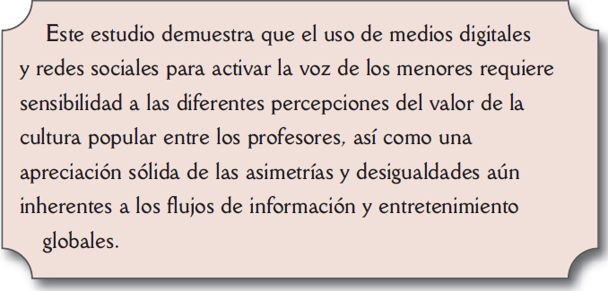 Estos hallazgos encajan con el trabajo de Moore (2013) que habla de varias fuentes de ansiedad entre los profesores de educación primaria y secundaria en cuanto a la inclusión de la cultura popular en las clases. Si bien el aprendizaje informal en contextos educativos formales puede ser muy valioso, este estudio ilustra que experiencias con el uso de la propia voz en una red social puede «configurar la construcción de conocimiento de los jóvenes en formas inesperadas», inspirando a los profesores a «estructurar prácticas informales que no estaba previsto que tuvieran un lugar legítimo en la educación formal» (Greenhow & Lewin, 2015: 18).