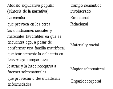 En la narrativa de María el hilo conductual a partir del cual se explica la enfermedad es un sentimiento de envidia, por lo que ubicamos tal expresión como el polo sensorial de la explicación del problema. El campo de sentido de esta representación popular ha de buscarse en la interpretación mesoamericana de que las emociones o deseos hostiles de los demás tienen, en ciertas circunstancias, la capacidad de rasgar la protección natural de las personas, proyectándose y materializándose como enfermedad (véase Aguirre Beltrán, 1980b: 45).
