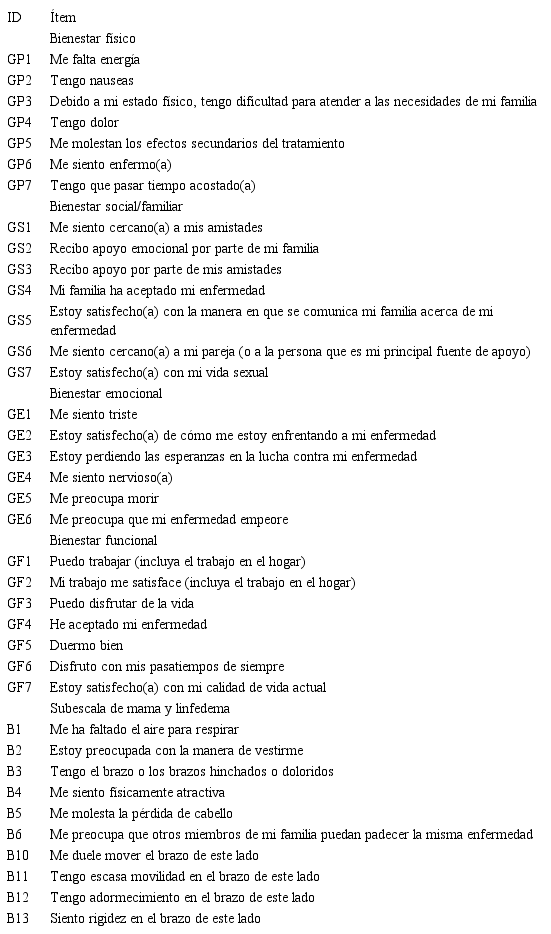 Con la FACT B+4 se valora la calidad de vida relacionada con la salud, específicamente en pacientes con cáncer de seno y linfedema. Contiene cinco dominios (bienestar físico, bienestar social/familiar, bienestar emocional, bienestar funcional y una subescala específica para cáncer de mama y linfedema). Cada ítem se puntúa en una escala tipo Likert de cinco niveles, desde cero (nada) hasta cuatro (muchísimo). El puntaje de cada dominio se obtiene sumando el puntaje de cada uno de los ítems y el puntaje total resulta de la suma de los dominios (Tabla 1).