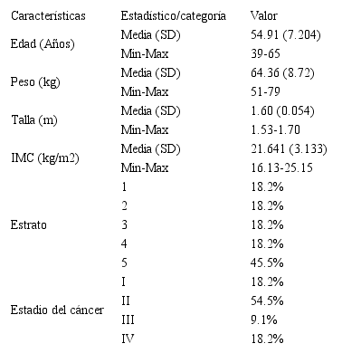 La información demográfica y clínica se presenta en la Tabla 2. El 72.3% de las pacientes recibió quimioterapia y radioterapia, el 81.8% recibió hormonoterapia y se realizó reconstrucción en el 54.5% (de este porcentaje, al 50% se le hizo colgajo con músculo dorsal ancho, en el 33.3% se usó prótesis expansiva, y en el 16.7%, colgajo de recto transverso del abdomen o TRAM, por su sigla en inglés). El 63.6% presentaba linfedema grado I; el 27.3%, grado II; y el 9.1%, grado III.
