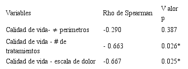 No se observa correlación significativa entre la calidad de vida y el perímetro del brazo afectado por el linfedema. Es de resaltar que los grados de linfedema no correspondían a estadios avanzados. En cuanto a la cantidad de tratamientos y la calidad de vida, se encontró una correlación inversa y significativa, lo que indica que, el incremento en el número de tratamientos afecta su percepción sobre las condiciones de bienestar. Por último, hubo una correlación significativa e inversa entre la calidad de vida y el grado de dolor, donde la percepción de alteración en la calidad de vida disminuyó en la medida en que el dolor se incrementaba.