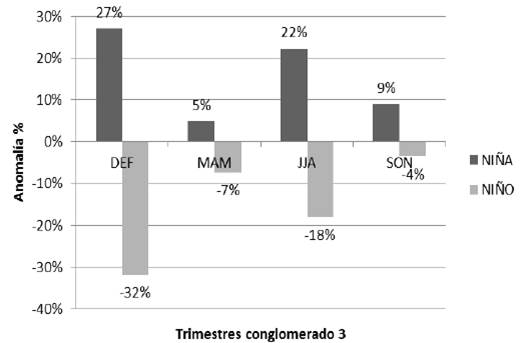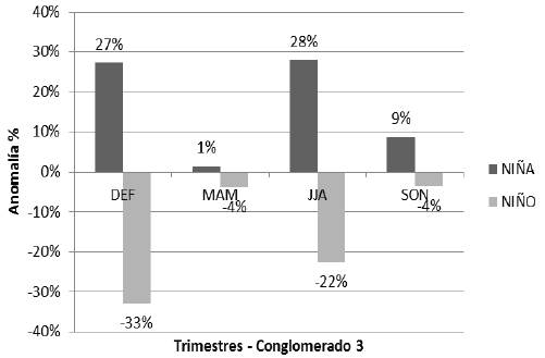 Existe una relación entre la precipitación y los eventos climáticos La Niña y El Niño (Caicedo, 2007). En las Figura 9 y 10 se observan incrementos de la precipitación bajo eventos La Niña (anomalía positiva) y reducciones bajo eventos El Niño (anomalía negativa) por trimestre. En las dos regiones se evidencian mayores anomalías durante los trimestres secos (DEF y JJA) que durante los trimestres de lluvia (MAM y SON).