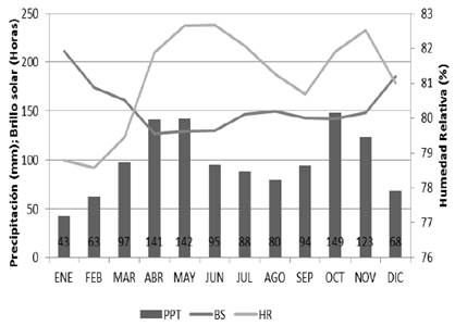 Se utilizó el catálogo oficial del Instituto de Hidrología, Meteorología y Estudios Ambientales (IDEAM, 2013) para identificar y seleccionar las estaciones climáticas ubicadas en el área de estudio. De acuerdo con los lineamientos de la Guía de prácticas climatológicas de la OMM (OMM, 2017), a partir de 1980 se trabajó con series históricas de 30 años de variables climáticas de impacto agropecuario, entre éllas: precipitación, temperatura del aire (temperatura máxima media, temperatura mínima media y temperatura media), humedad relativa y brillo solar.