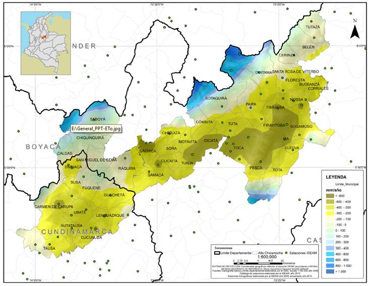 Lo anterior indica que a escala anual existe un excedente hídrico regional. No obstante, si se analizan sólo las estaciones del conglomerado 3, el promedio de precipitación fue de 944 mm/año frente a un promedio de ETo de 1148 mm/año, lo que indica deficiencias hídricas de aproximadamente 203 mm por año, siendo este valor mayor que lo presentado en el Valle de Ubaté y Chiquinquirá.