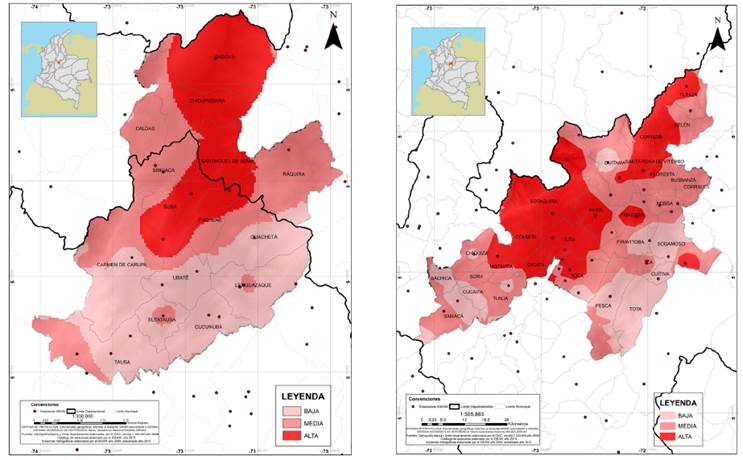 Teniendo en cuenta la importancia de la región como nicho central de la producción lechera especializada del país (Carulla y Ortega, 2016) y de acuerdo con las características climáticas encontradas en el presente estudio, es evidente el grado de vulnerabilidad al que está expuesto este renglón de la producción. Saboyá y Lenguezaque en el Valle de Ubaté y Chiquinquirá y Sotaquirá, Paipa y Cerinza en el Valle del Alto Chicamocha, son altamente vulnerables tanto a condiciones de sequía como de exceso hídrico. Esta situación es debida en gran medida a la acumulación de fenómenos metereológicos o climáticos que no necesariamente son considerados extremos (IPCC, 2012).