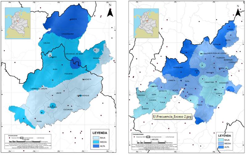 Ambas regiones son susceptibles a la ocurrencia de eventos de déficit hídrico en gran parte del área, ya que el 63% del área del Valle de Ubaté y Chiquinquirá y el 78% en el Alto Chicamocha se encuentran en las categorías de frecuencia alta y media (Figura 14). El 58% del área del Valle de Ubaté y Chiquinquirá presenta alta y media frecuencia de ocurrencia de eventos de exceso, principalmente hacia el norte de la región (Figura 15).