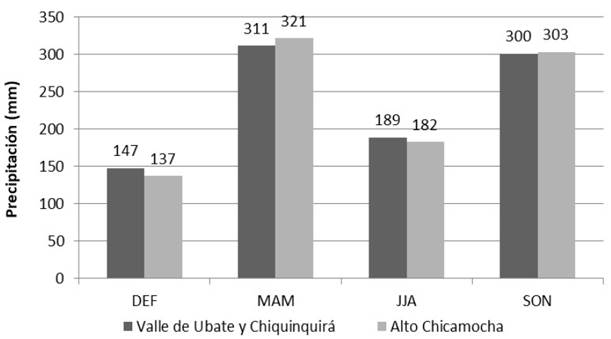 No existieron grandes diferencias en los volúmenes trimestrales de precipitación entre ambas regiones (máximo 10 mm). En las temporadas secas se observaron menores valores de lluvias en la región del Alto Chicamocha, así como mayores valores de lluvia acumulada durante las temporadas húmedas (Figura 2B). Esto indica que, en promedio, se presentan mayores fluctuaciones en la precipitación a través del año en el Alto Chicamocha que en el Valle de Ubaté y Chiquinquirá.