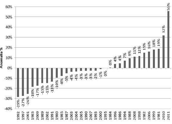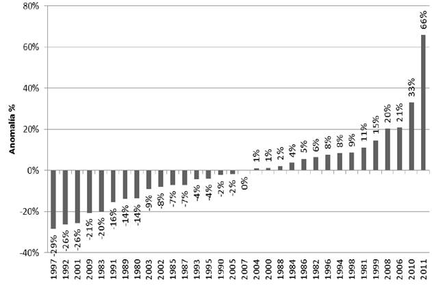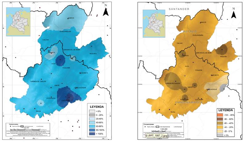 En el sur del valle se presentaron las mayores anomalías positivas, en el municipio de Cucunuba, donde se registró un aumento de 100% en la precipitación durante 2011. Los municipios Simijáca, Carmen de Carúpa, Ubaté, Sutatausa y Ráquira presentaron las mayores reducciones (entre 40% y 60%) durante 1997 (Figura 6).
