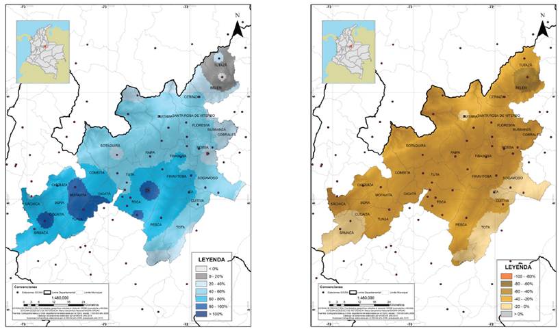 Los municipios de Sogamoso, Tibasosa, Iza, Toca, Pesca, Oicata y Tunja presentaron el mayor déficit hídrico de la región. Por otro lado, las áreas que limitan con el departamento de Santander registraron excesos hídricos que alcanzan los 1000 mm al año (Figura 13).