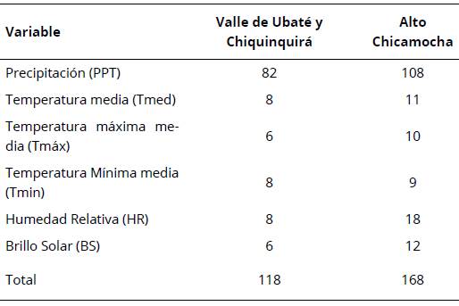 El número de series dependió de la variable climática, fue así como algunas estaciones no registraron información de todas las variables, por tanto, se encontró que la variable precipitación contaba con 82 series en el Valle de Ubaté y Chiquinquira, mientras que en la región del Alto Chicamocha se identificaron 108 series de la variable. A diferencia de lo que ocurre con las variables de temperatura, donde el numero disminuyó incluso a 8 series en el Valle de Ubaté y Chiquinquirá (Tabla 2).