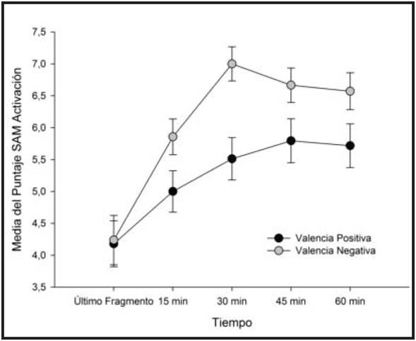Se realizó un ANOVA de medidas repetidas para conocer el estado de activación emocional post-inducción (durante el último video, a los 15, 30, 45 y 60 minutos después de la inducción emocional) en función del Tipo de Inducción Emocional y el Sexo. Se encontró una interacción entre el tiempo y la valencia [F(4, 316) = 2.5461, p < .05, ηp2 = .031] (ver Figura 1). Para la valencia negativa, el análisis post hoc de Fisher mostró una diferencia significativa entre la activación valorada en el último video y la activación valorada a los 15, 30, 45 y 60 minutos postinducción (p < .001, para todos los casos). Para la valencia positiva se encontró una diferencia significativa entre la activación valorada en el último video y la activación valorada a los 15, 30, 45 y 60 minutos postinducción (p < .01, para todos los casos). Además se comparó la activación valorada entre los dos tipos de valencia a los 30 minutos post-inducción. Se encontró una diferencia significativa en la activación valorada a los 30 minutos para la Inducción Positiva respecto de la Inducción Negativa (p < .01). Por su parte, no se encontraron diferencias significativas en la duración de la activación post-inducción en función del sexo.