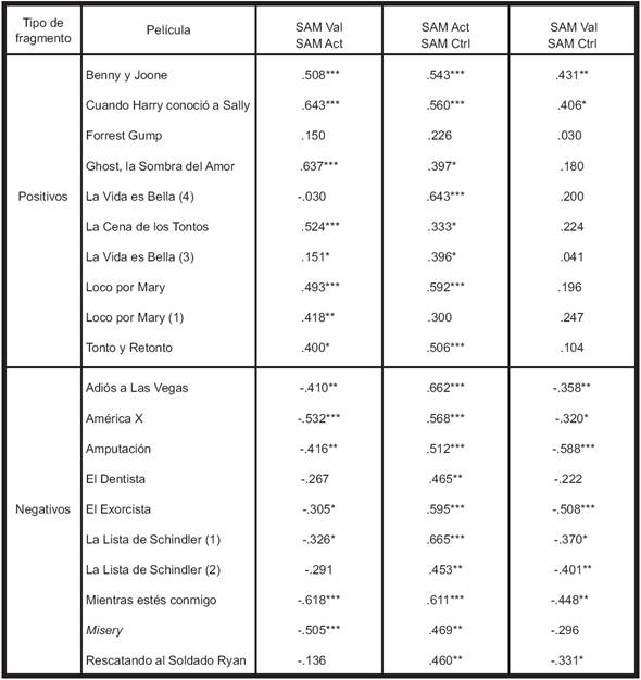 Se analizaron las correlaciones entre las subescalas del SAM, Valencia, Activación y Control. Se encontró que en la mayoría de los fragmentos de películas las correlaciones entre Valencia y Activación, entre Valencia y Control, y entre Activación y Control fueron significativas (ver Tabla 2).