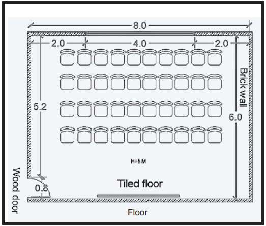 We used modular panels with acoustic properties for the acoustic intervention. These panels were made with a trapezoidal wood structure filled with fiberglass to avoid specular reflections. The material used provided absorption and the diffusion was generated by the prism shape because it prevents sound reflections to use the same incidence angle when returning. These panels also act as lowfrequency resonators due to the distance that separates the material from the wall where it is installed. All this helps to diminish the standing waves. The intervention process consisted on selecting a pilot classroom to install the solution and prove its effectiveness. The space had the specifications established in Figure 1. In order to know the acoustic characteristics of the classroom, we calculated the reverberation time (RT) with a sound level meter, according to the method established in the international normative. The results are shown in Table 1.