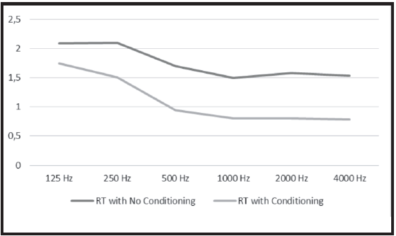 These findings would seem to confirm what Santisteban and Santalla (1990) said in the studies on noise and attention, in the sense that acoustical stimulation seems to act in an intermittent way as an activator, generating an overactivation in the individual, altering their performance indexes and negatively influencing the performance of the subjects. At the same time, it confirms what Escalona (2006) and Yang and Hodgson (2007) pointed, regarding the need to shorten the reverberation time as a control measure of acoustics in the classrooms, in order to improve the intelligibility in those spaces.