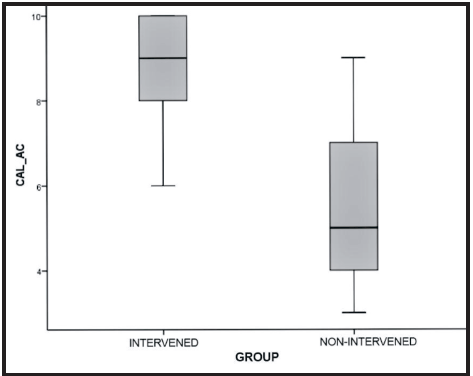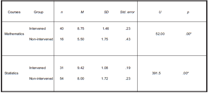 The Kolmogorov-Smirnov normality test indicated non-normality in both group (intervened group [I-G] and non-intervened group [NI-G], K-S test I-G = .24, < .01; K-S test NIG = .30, p < .01). The average of correct answers in the word list for the math course in the I-G (n = 40) was 8.75 (SD = 1.46) over 10 points, being higher than the average of the NIG (n =16) (average = 5.50; SD = 1.75). The difference between the means of these groups was significant (U = 52.00; p < .01) (see Table 3 and Graphic 2).