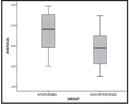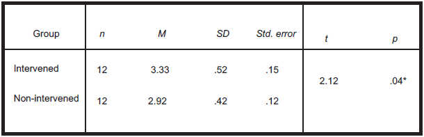 The Shapiro-Wilk normality test indicated the normality of this group of data (S-W test I-G = .90, p > .05; S-W test NI-G =.97, p > .05). Taking into account the average of the scores given by the two judges, the index of attention for the intervened group (n = 12) was 3.33 (SD = .52) and for the other group (n = 12) was 2.92 (SD = .42). The analysis of the differences in the average score of each group was significant (t = 2.12; p < .05) (see Table 4 and Graphic 3). In order to discard variables tied to the course, we compared the average of both courses with the student’s t-test and there were not substantial differences between them (t = -.56; p > .05).