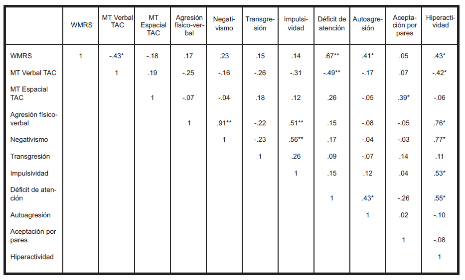 Además, como puede apreciarse en la Tabla 1, los resultados mostraron asociaciones entre el desempeño de los niños en tareas de MT verbal y los Déficit de Atención percibidos por los docentes (r = .49; p < .01) y la Hiperactividad (r = -.42; p < .05) y entre el desempeño de los niños en tareas de MT visoespacial y los comportamientos de Aceptación por pares percibidos por los docentes (r = .39; p < .05).