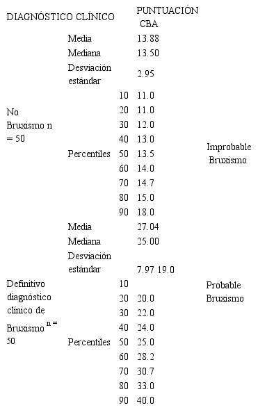 La Tabla 4 muestra las puntuaciones del cuestionario de bruxismo autoinformado. Sobre la base de estos datos, se propone que con puntajes de 0 a 18 es improbable que el paciente tenga síntomas de bruxismo, puntuaciones de 19 a 24 indicarían un puntaje promedio de diagnóstico clínico (probables síntomas de bruxismo) y una puntuación de 25 o superior sería indicativo de un diagnóstico de síntomas definitivos de bruxismo.